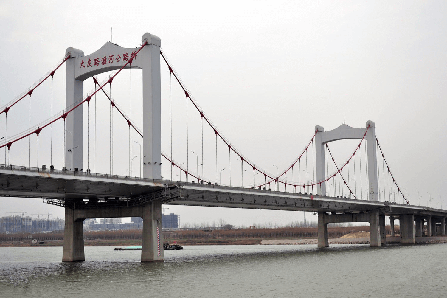 蚌埠市大慶路淮河公路橋于2009年12月開(kāi)建,工期為3年,是蚌埠第三座淮河大橋,工程投資總概算達(dá)6.87億元。全線將設(shè)互通立交一處,采用雙向六車(chē)道設(shè)計(jì),并設(shè)置非機(jī)動(dòng)車(chē)道和人行道,設(shè)計(jì)速度60公里/小時(shí)。主橋采用雙塔雙索面自錨式懸鎖結(jié)構(gòu),路橋全長(zhǎng)2.38公里,其中主橋長(zhǎng)1778米,兩端接線602米,南岸設(shè)有四層八向互通立交,是淮河上第一座自錨式懸鎖橋。